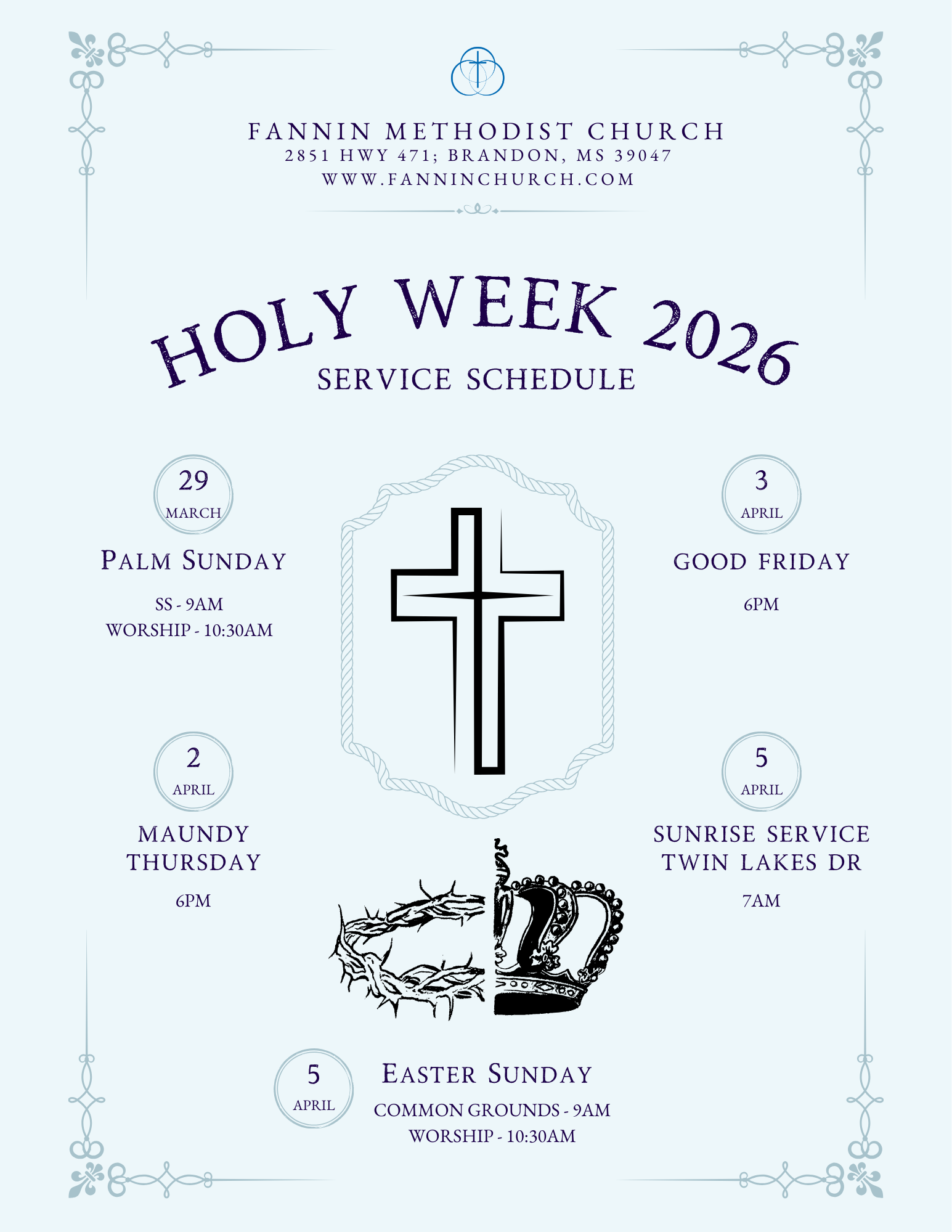 Our Easter celebration at Fannin Methodist Church starts at 9am with Common Ground Breakfast followed by a worship service at 10:30am. Come celebrate the empty tomb with us and bring your family.